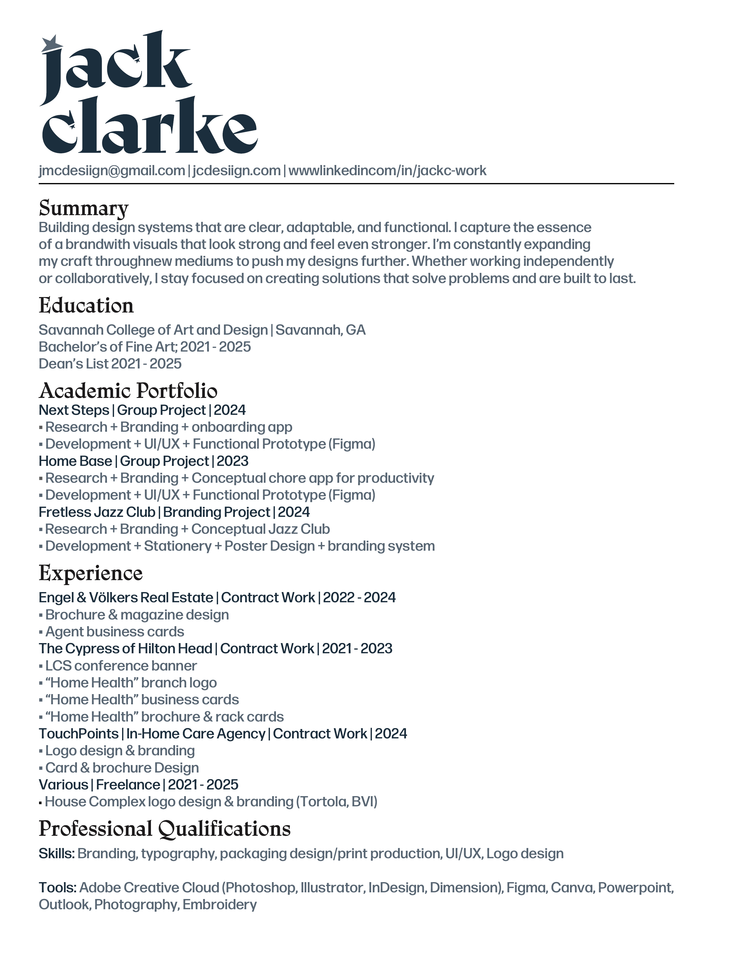 Hey, I'm Jack. I create innovative design solutions that are clear, adaptable, and functional. I specialize in capturing the essence of a brand with visuals that look strong, and feel stronger. With a hands-on process, I work across mediums to explore new ways to push my designs further. Whether I am working independently or collaborating, I stay focused on creating designs that are thoughtful, and built to last.