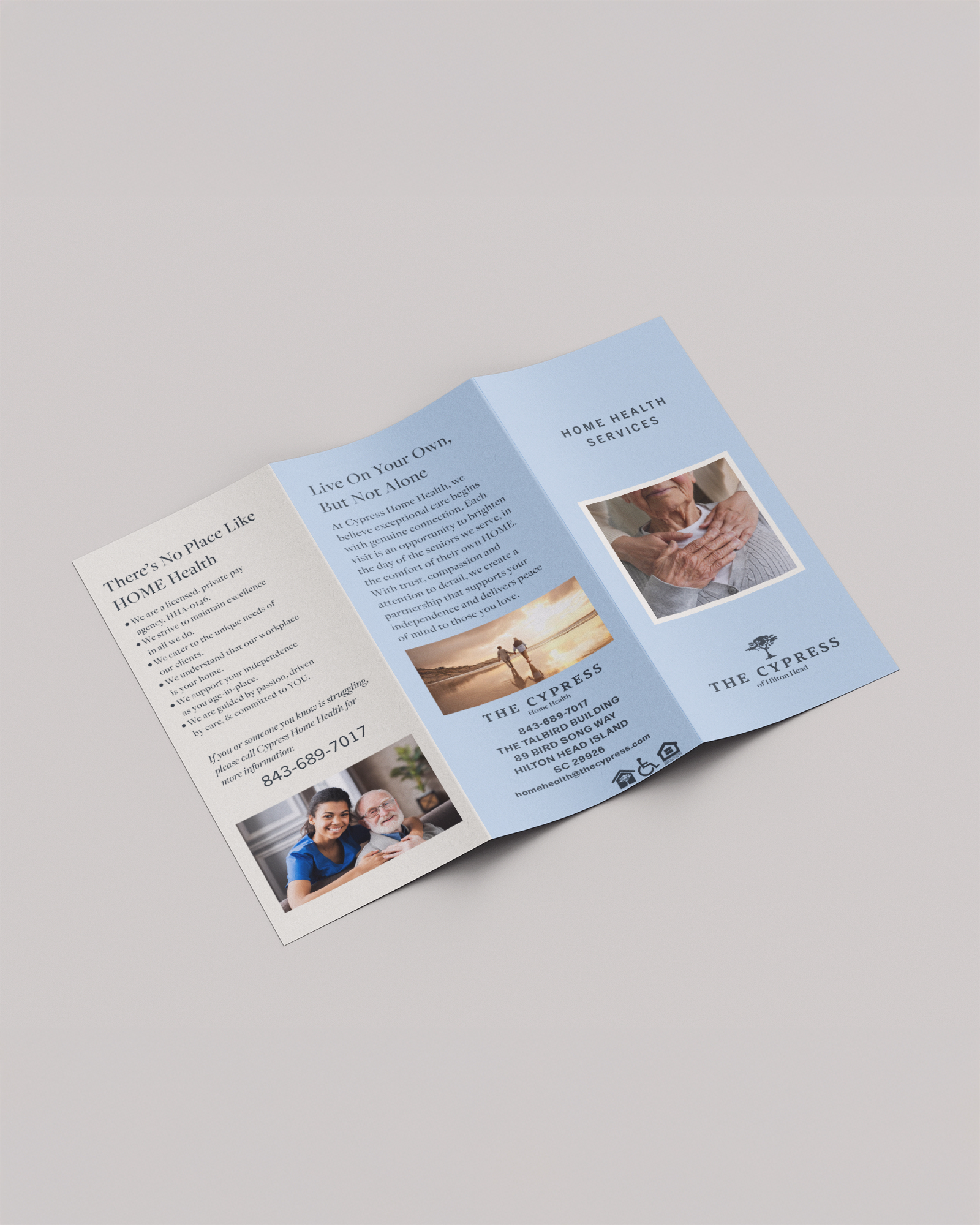 From informative print pieces to engaging event visuals, each design element strengthens The Cypress’s mission to foster community, comfort, & connection. The refreshed Home Health identity & cohesive print system reinforce trust & warmth, while the illustrated event piece showcases the brand’s flexibility & creativity. The result is a unified visual presence that balances the existing brand with extra personality. It captures the spirit of Hilton Head living while keeping The Cypress approachable, authentic, & connected to its community.