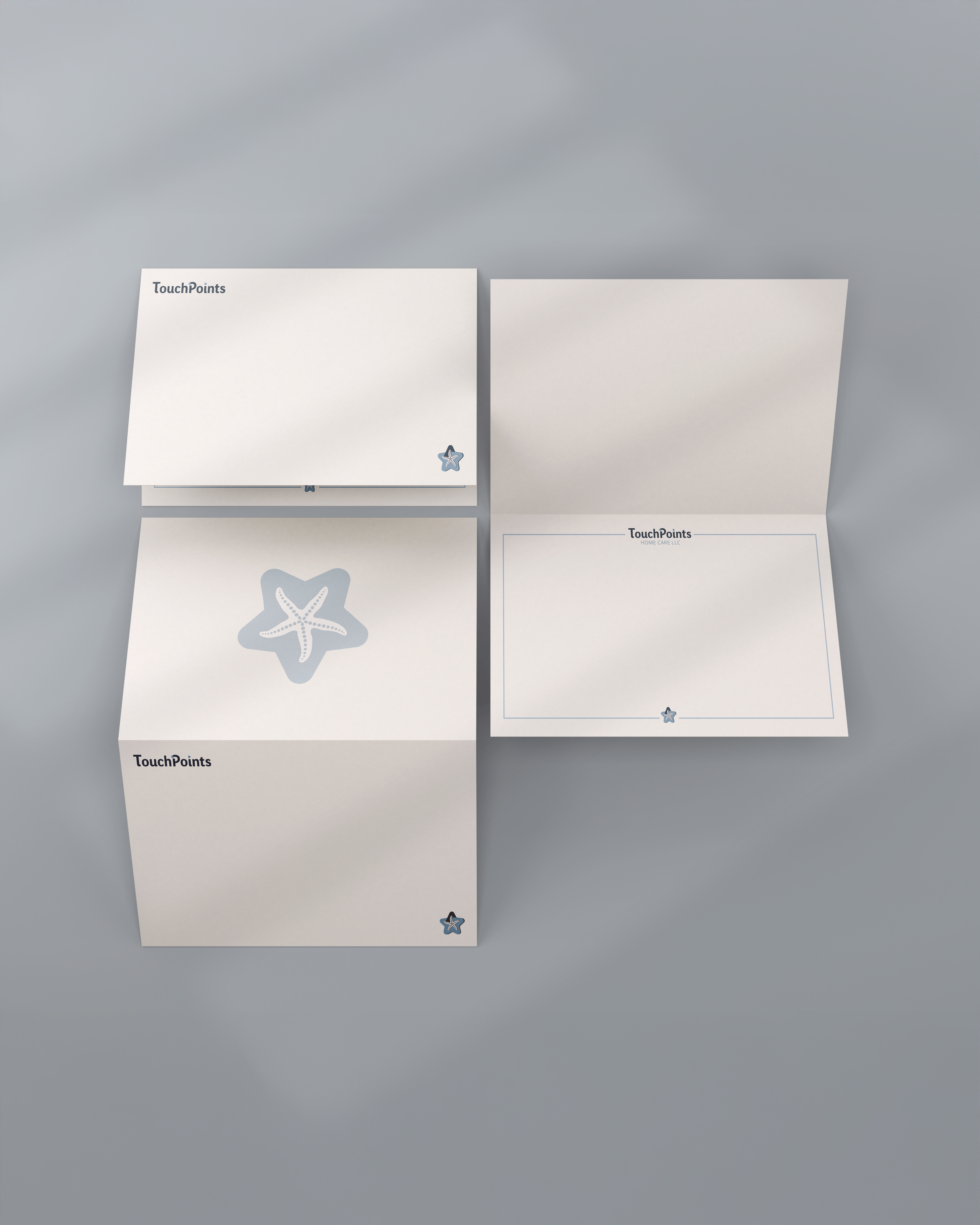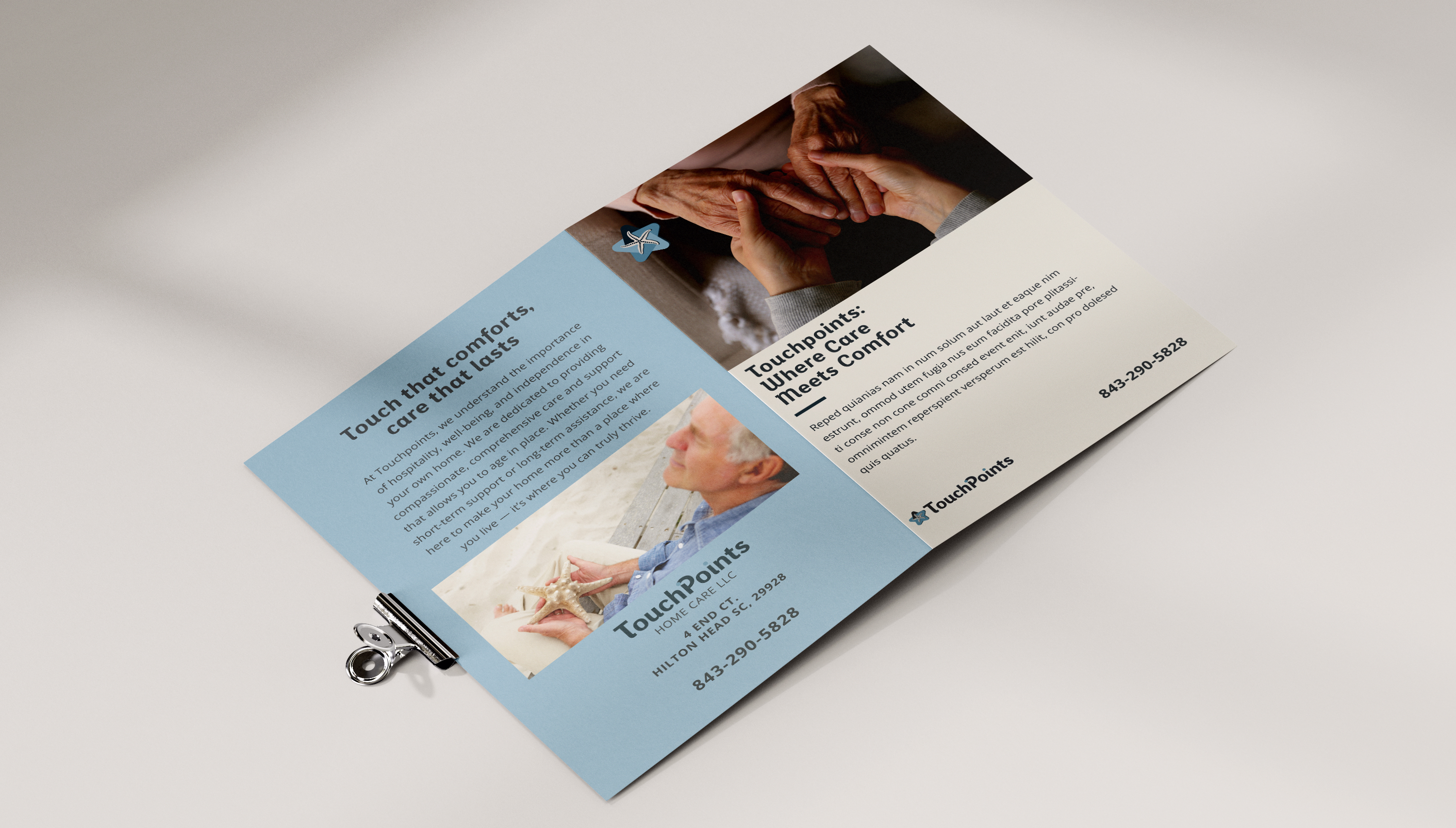 design process focused on simple, clean brand messaging to ensure comprehension & readability with senior citizens. The overall branding takes aspects of beach artifacts & uses them as wellness imagery. The logo reflects the different branches of home health care, all coming together with the starfish: the symbol of peace of mind.